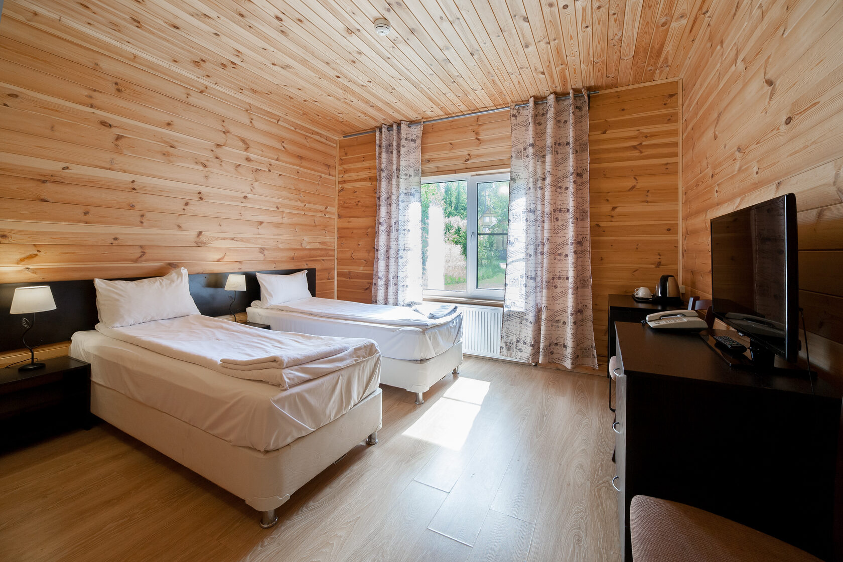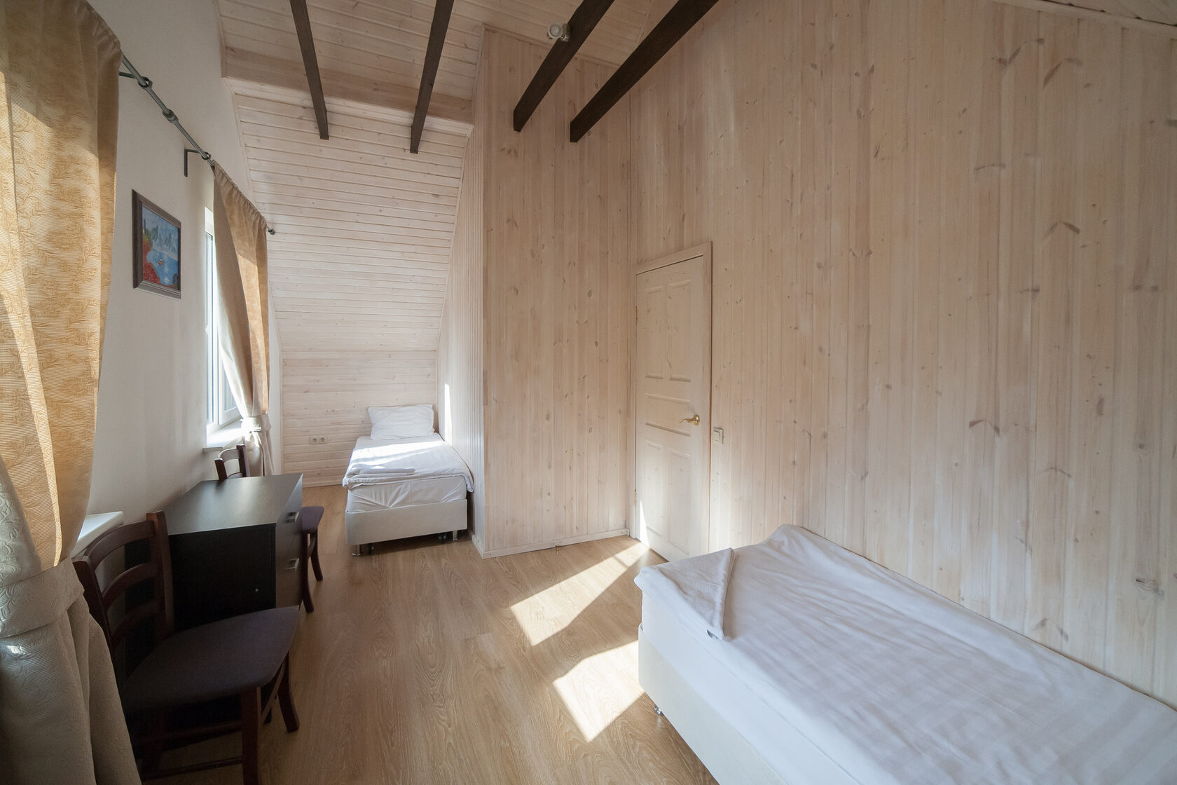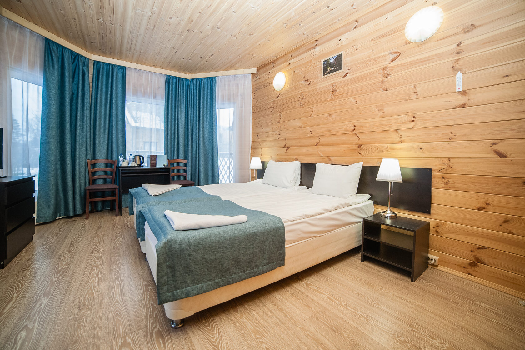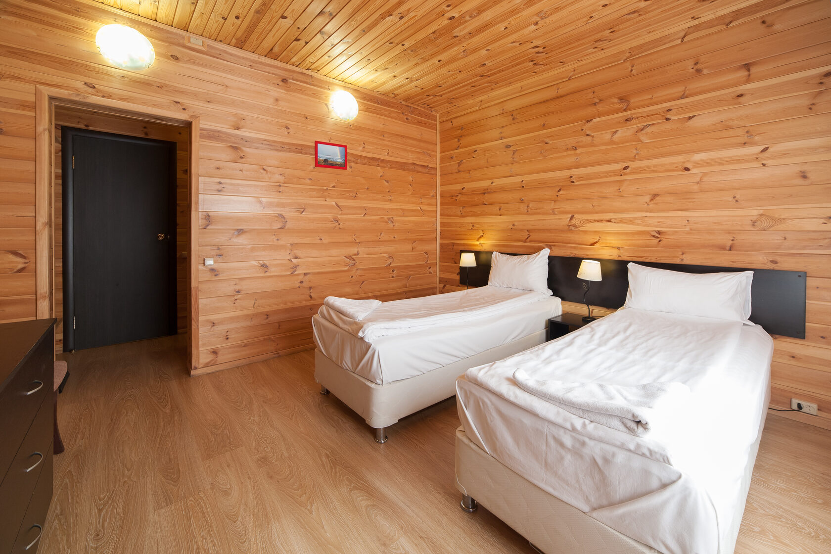 Уютный номер с двумя односпальными кроватями, оформленный в тёплых тонах натурального дерева. Прихожая при входе предоставляет место для хранения верхней одежды. Номер находится на первом этаже гостиничного деревянного корпуса. Разрешено проживание с питомцем.