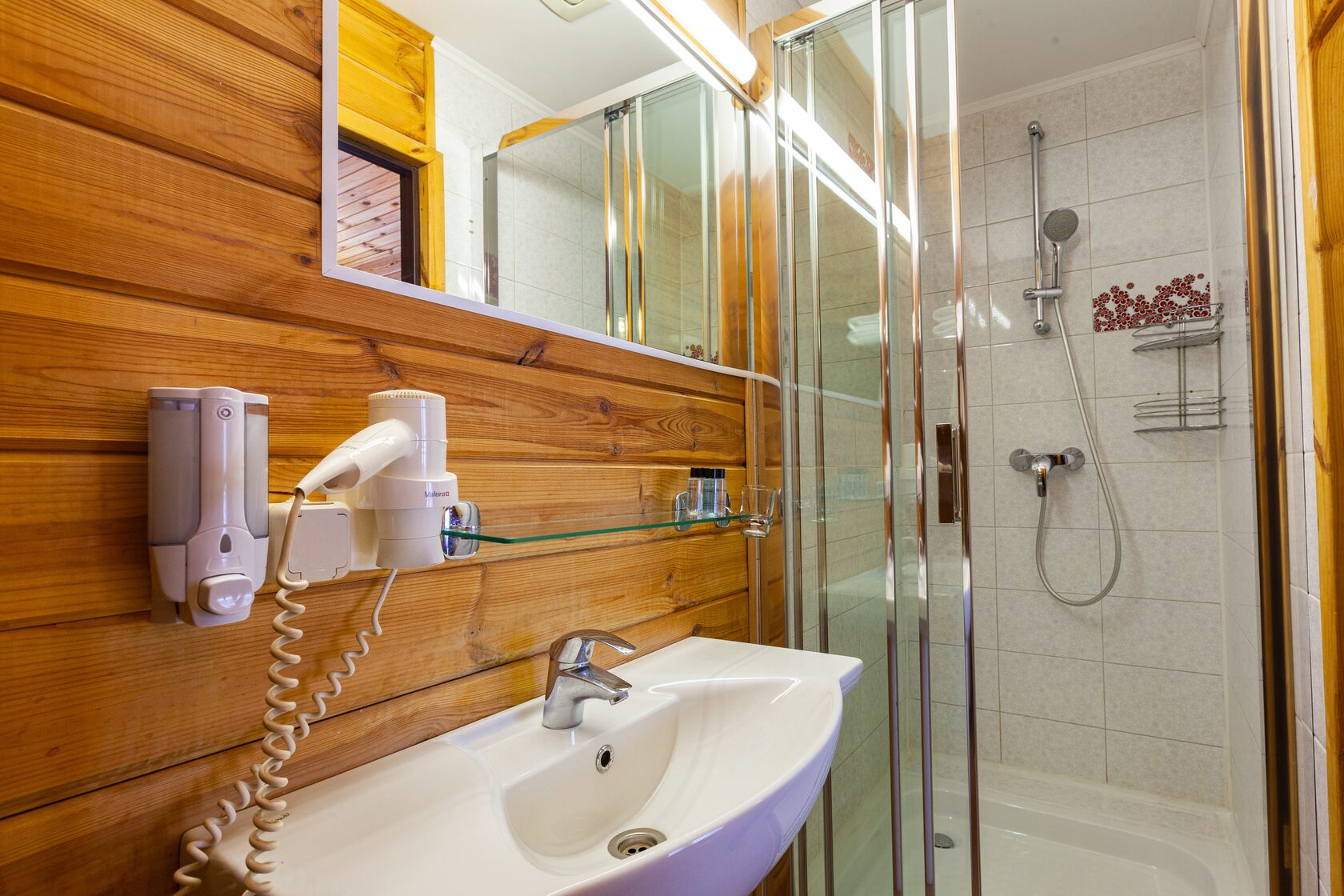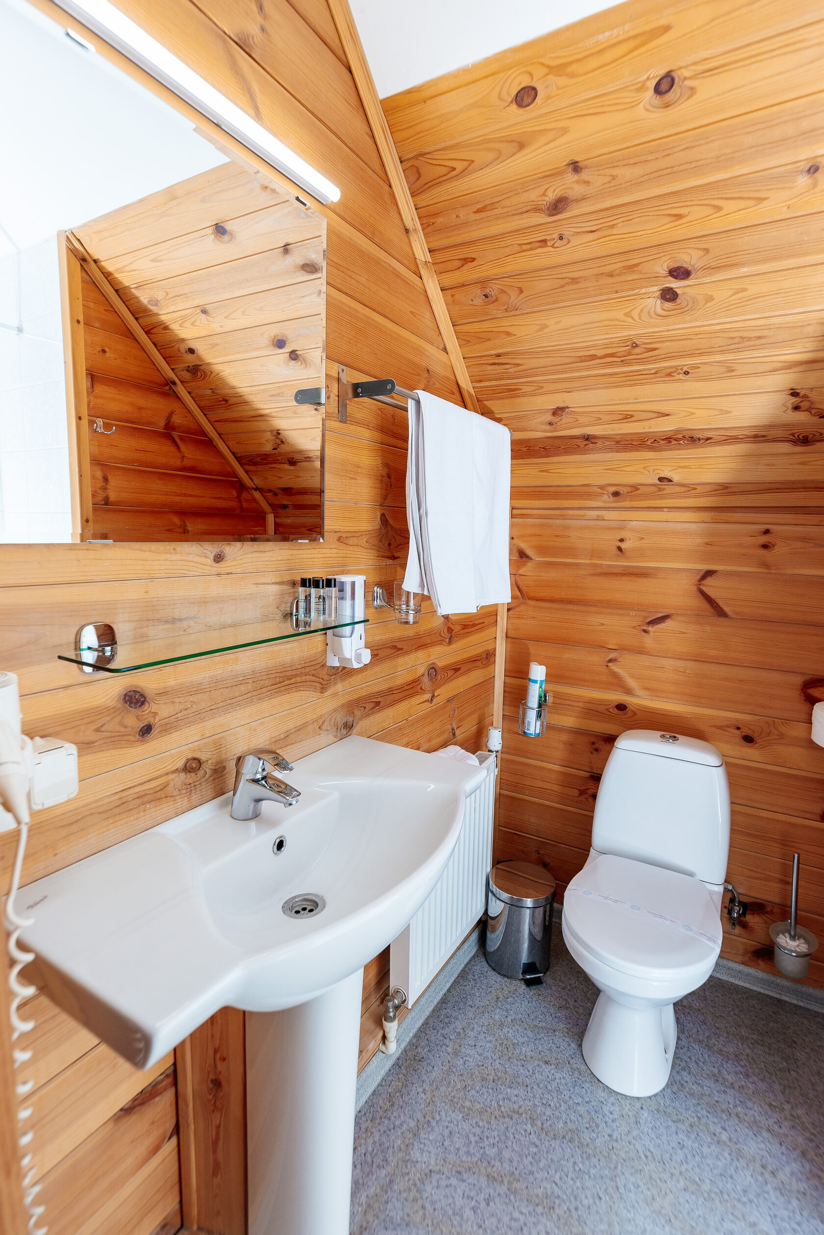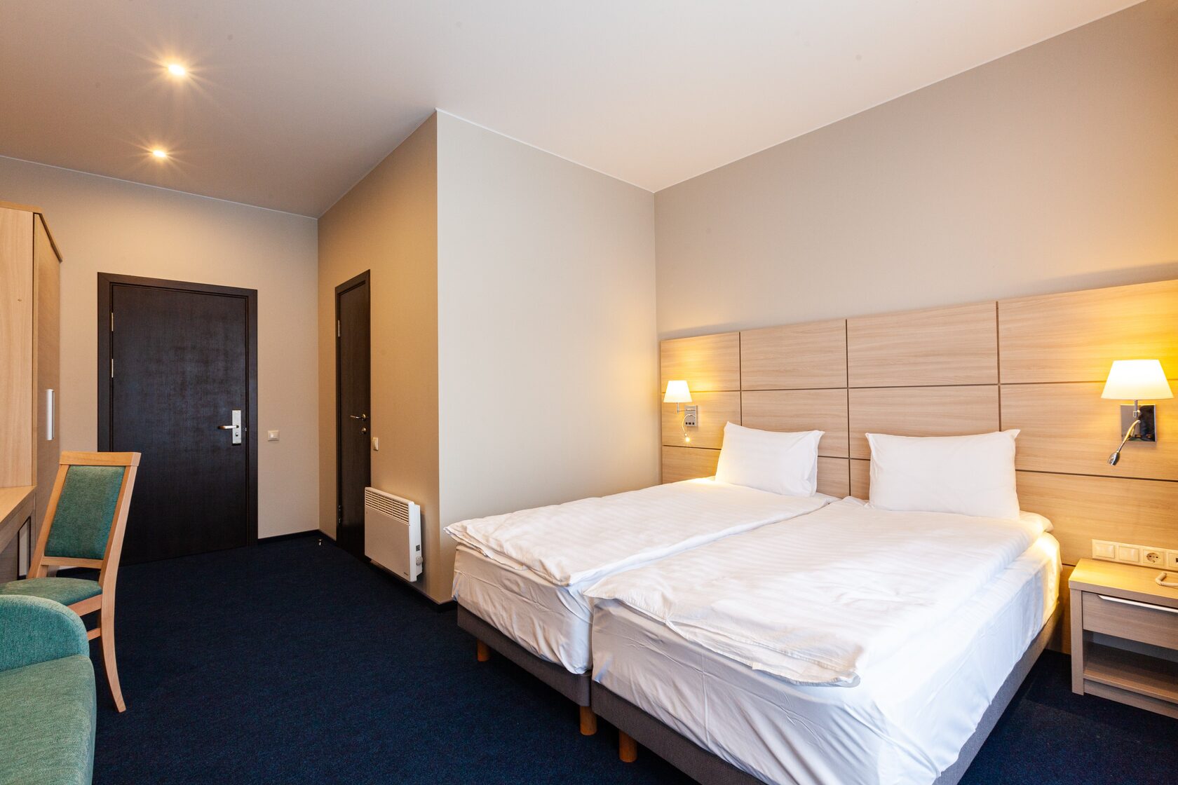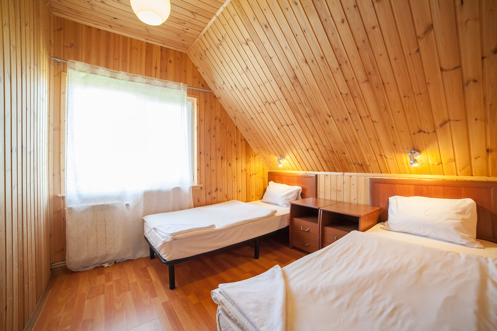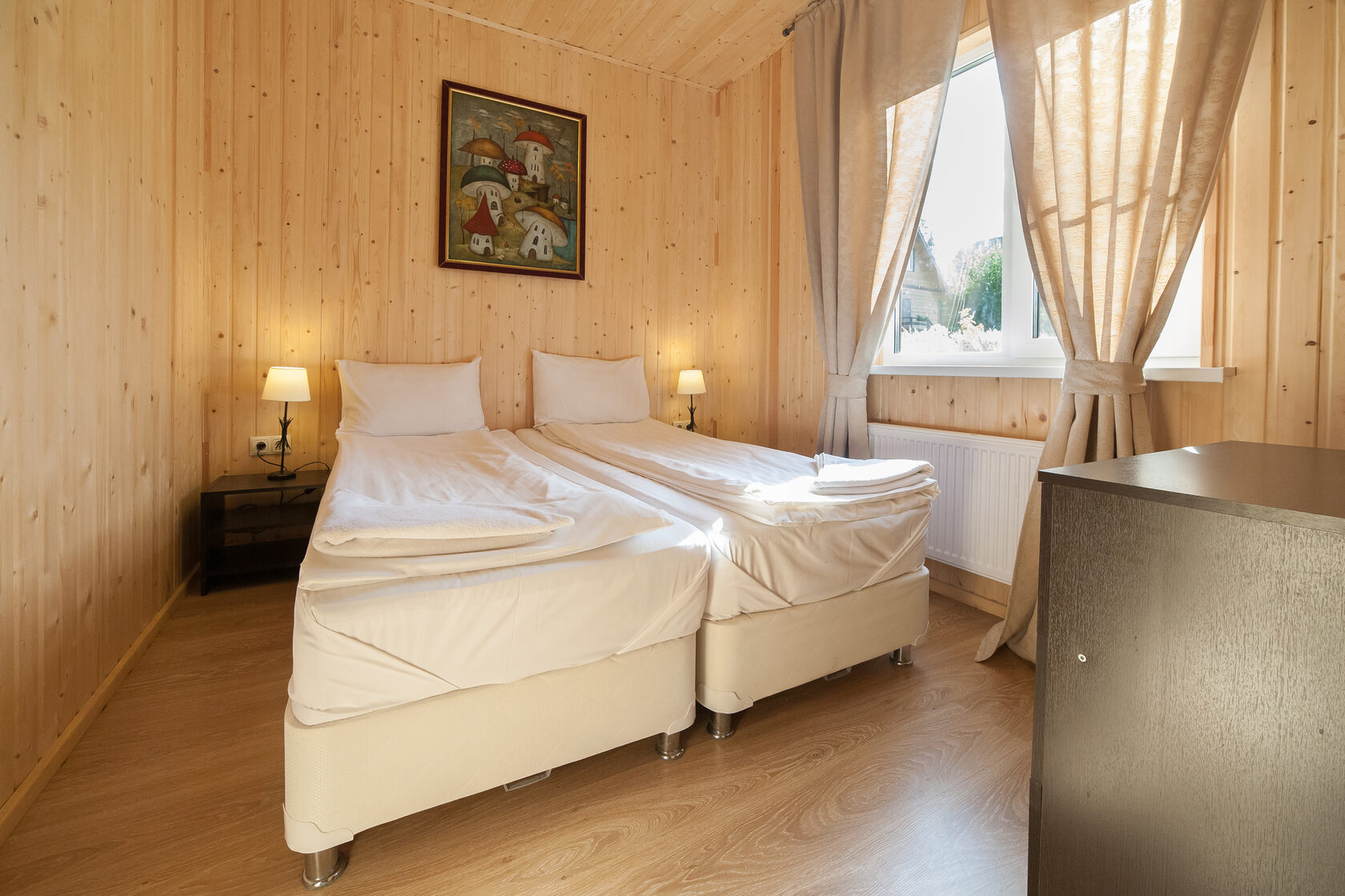 Уютный номер с двумя односпальными кроватями, оформленный в тёплых тонах натурального дерева. Прихожая при входе предоставляет место для хранения верхней одежды. Номер находится на первом этаже гостиничного деревянного корпуса. Разрешено проживание с питомцем.