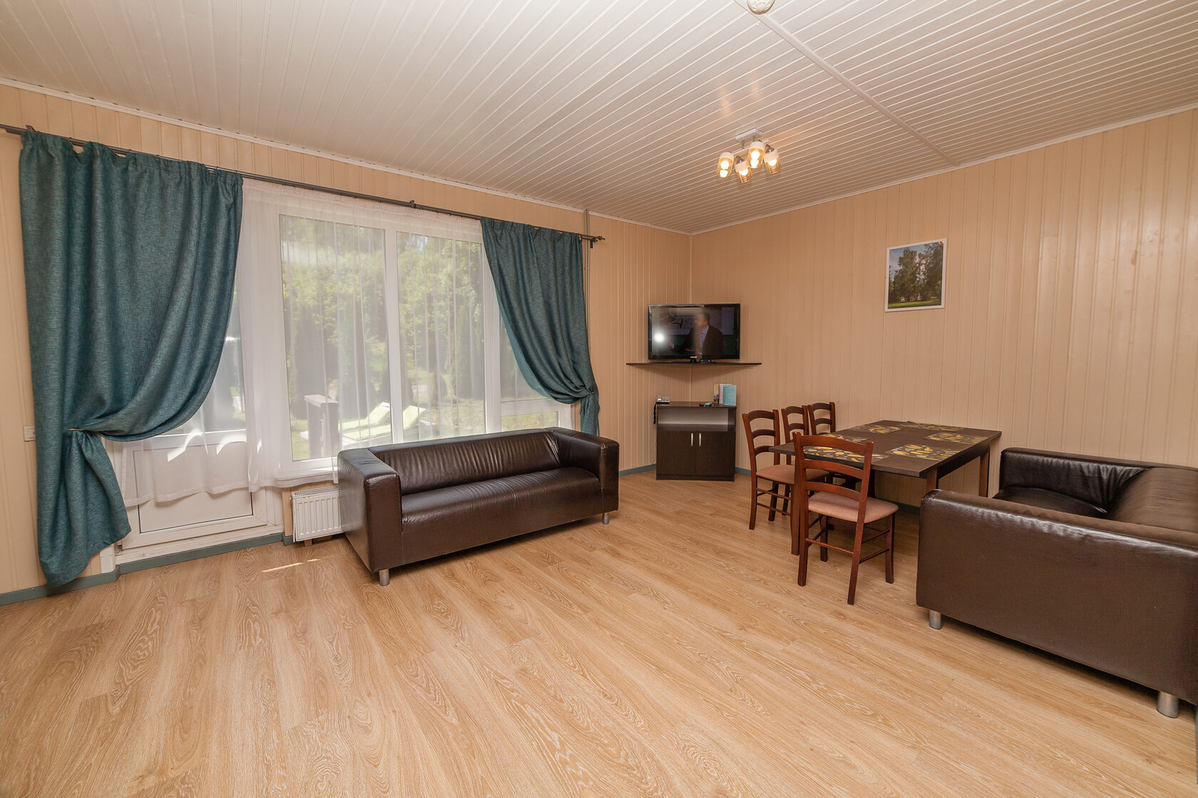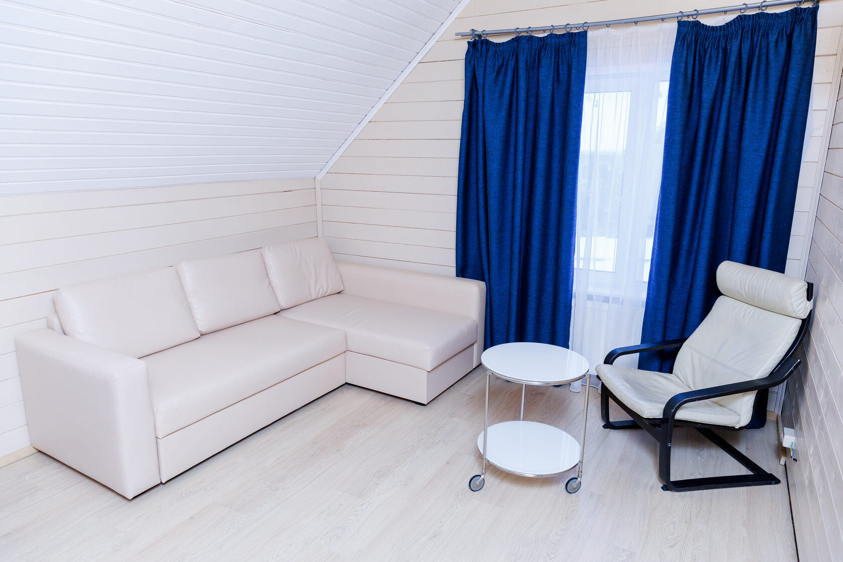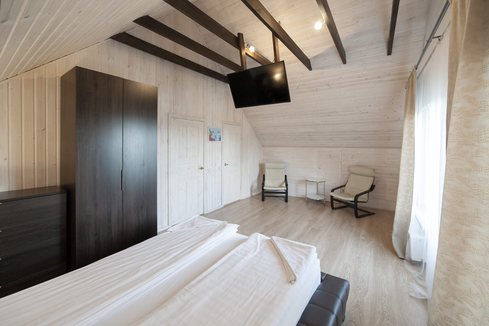 Двухкомнатный номер оформлен в уютном стиле с наклонным потолком и деревянной отделкой, подчеркивающей атмосферу загородного отдыха. Просторное пространство разделено на зону гостиной и спальни с выходом на балконом для отдыха на свежем воздухе. Номер расположен на втором этаже гостиничного деревянного корпуса.