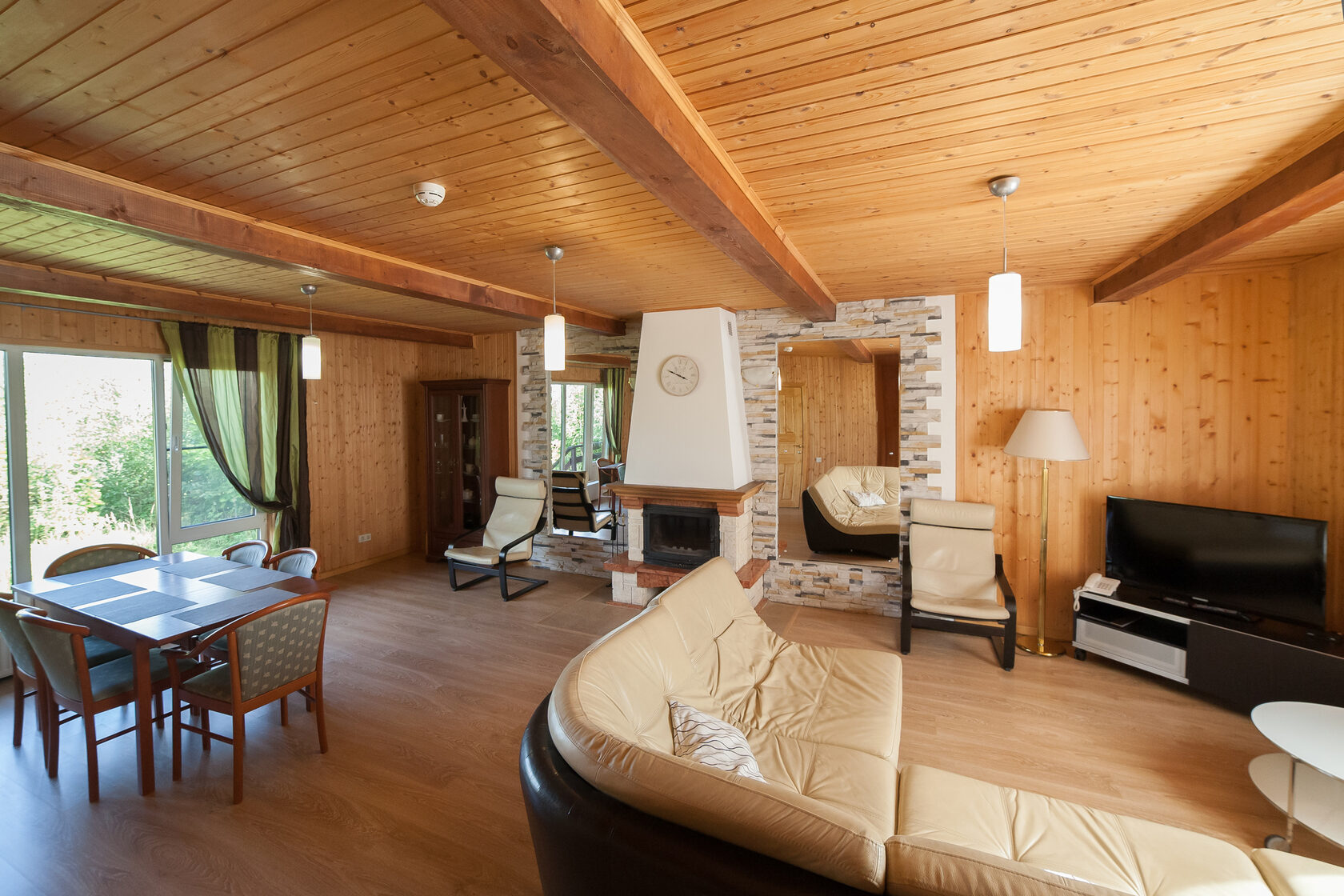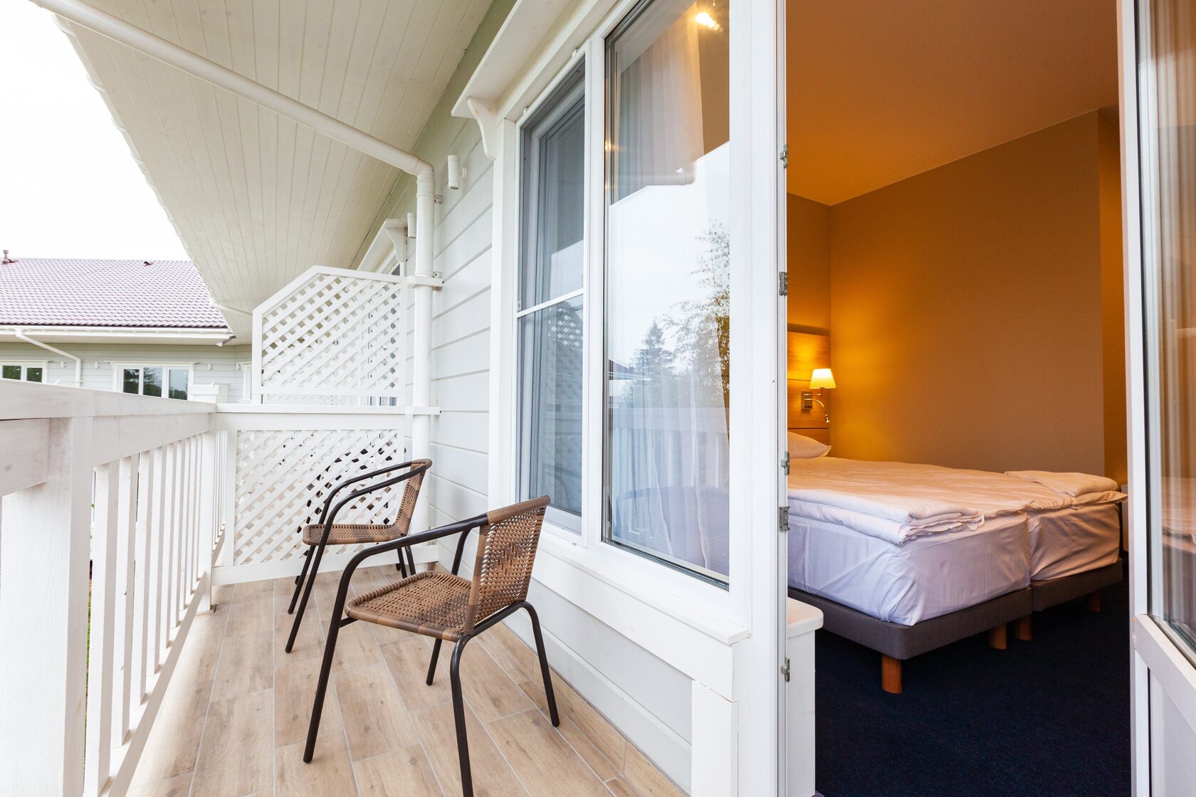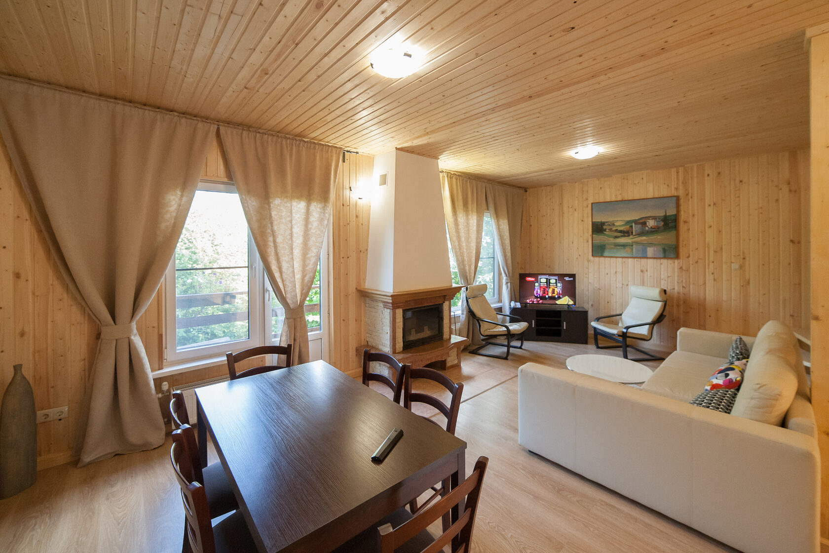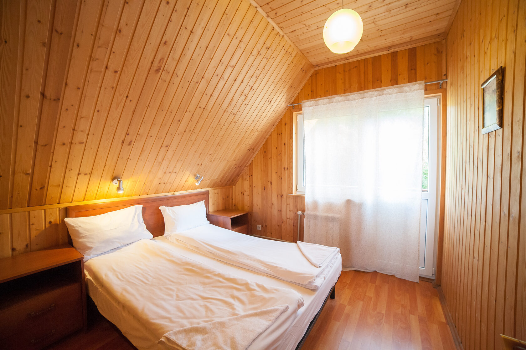 Двухкомнатный номер оформлен в уютном стиле с наклонным потолком и деревянной отделкой, подчеркивающей атмосферу загородного отдыха. Просторное пространство разделено на зону гостиной и спальни с выходом на балконом для отдыха на свежем воздухе. Номер расположен на втором этаже гостиничного деревянного корпуса.