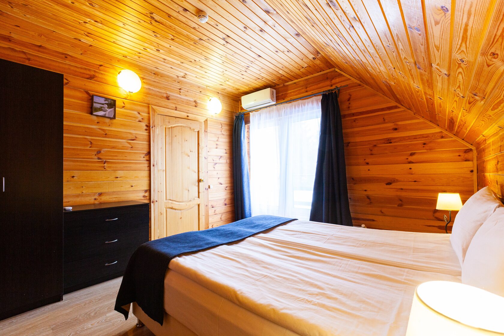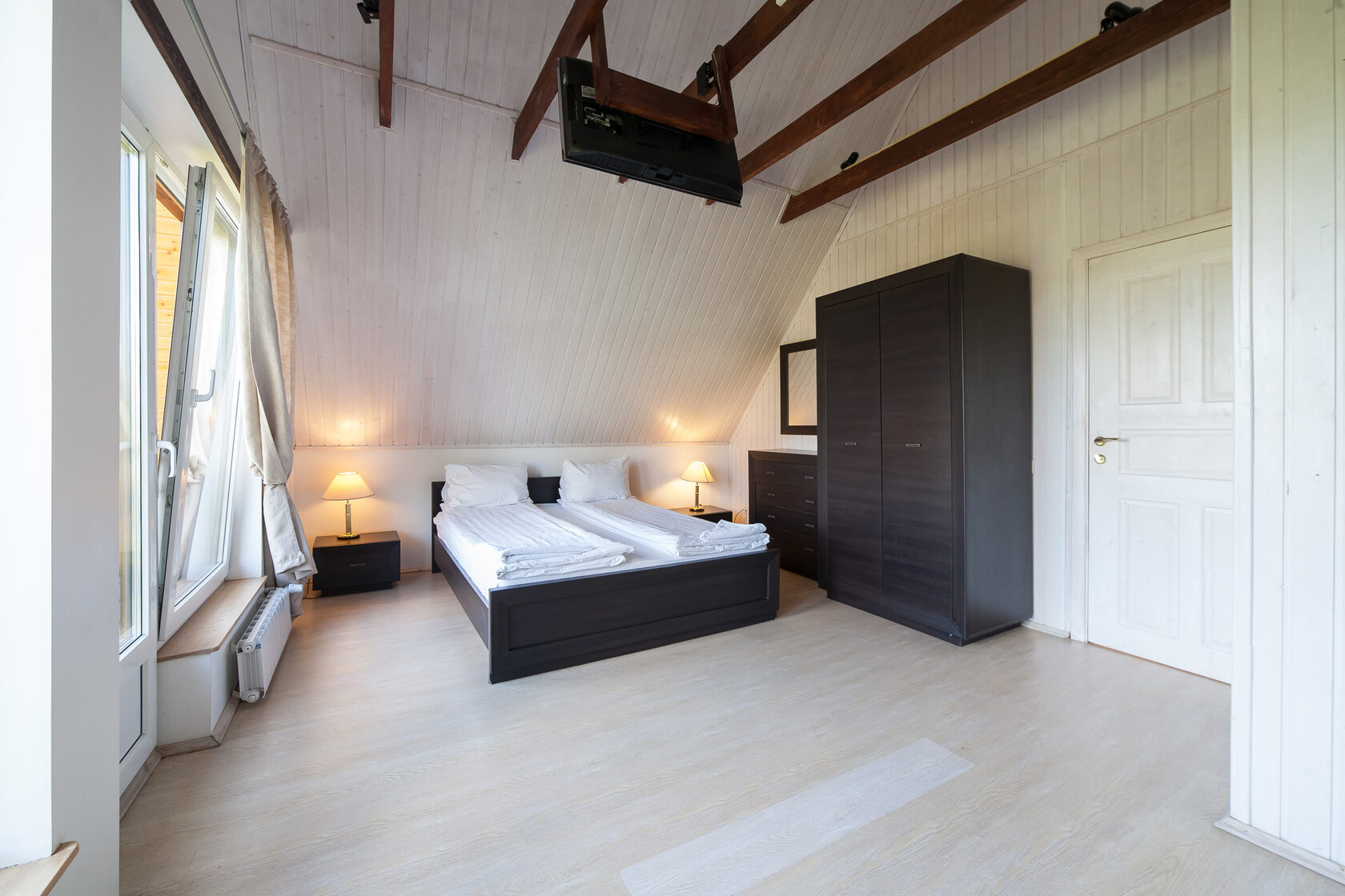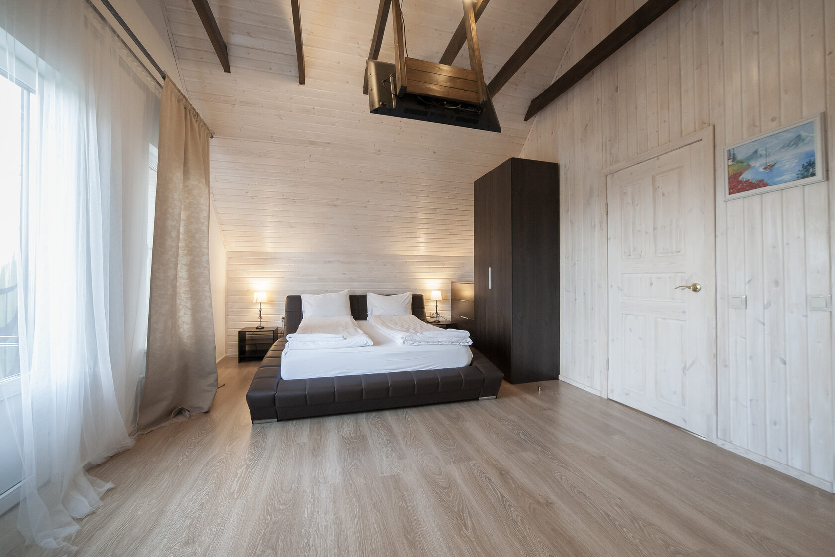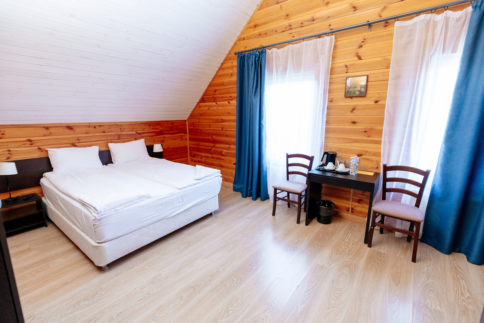 Номер оформлен в уютном стиле с наклонным потолком и деревянной отделкой, подчеркивающей атмосферу загородного отдыха. Просторное пространство, минималистичная мебель и мягкое освещение способствуют расслаблению. Номер находится на втором этаже гостиничного деревянного корпуса.