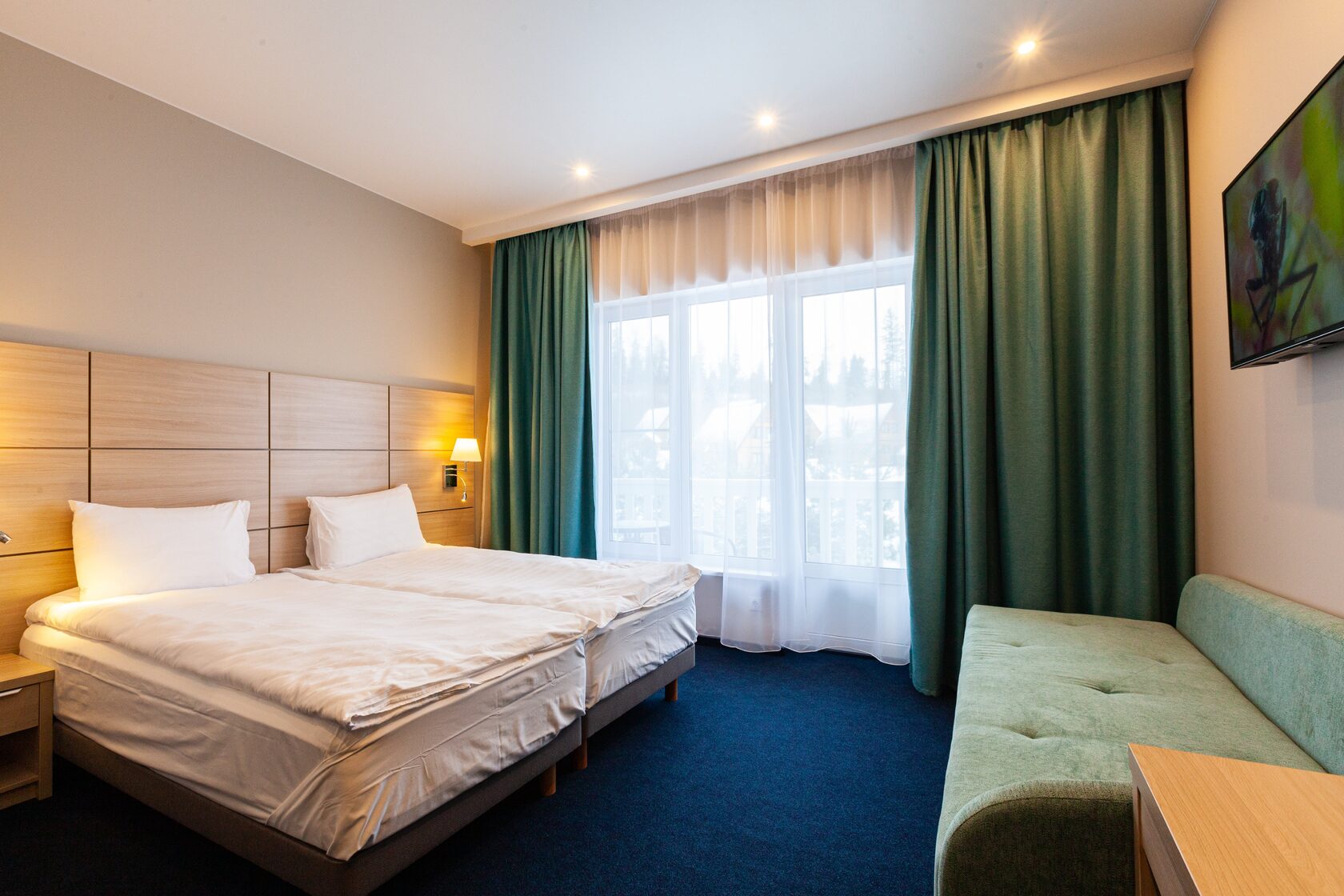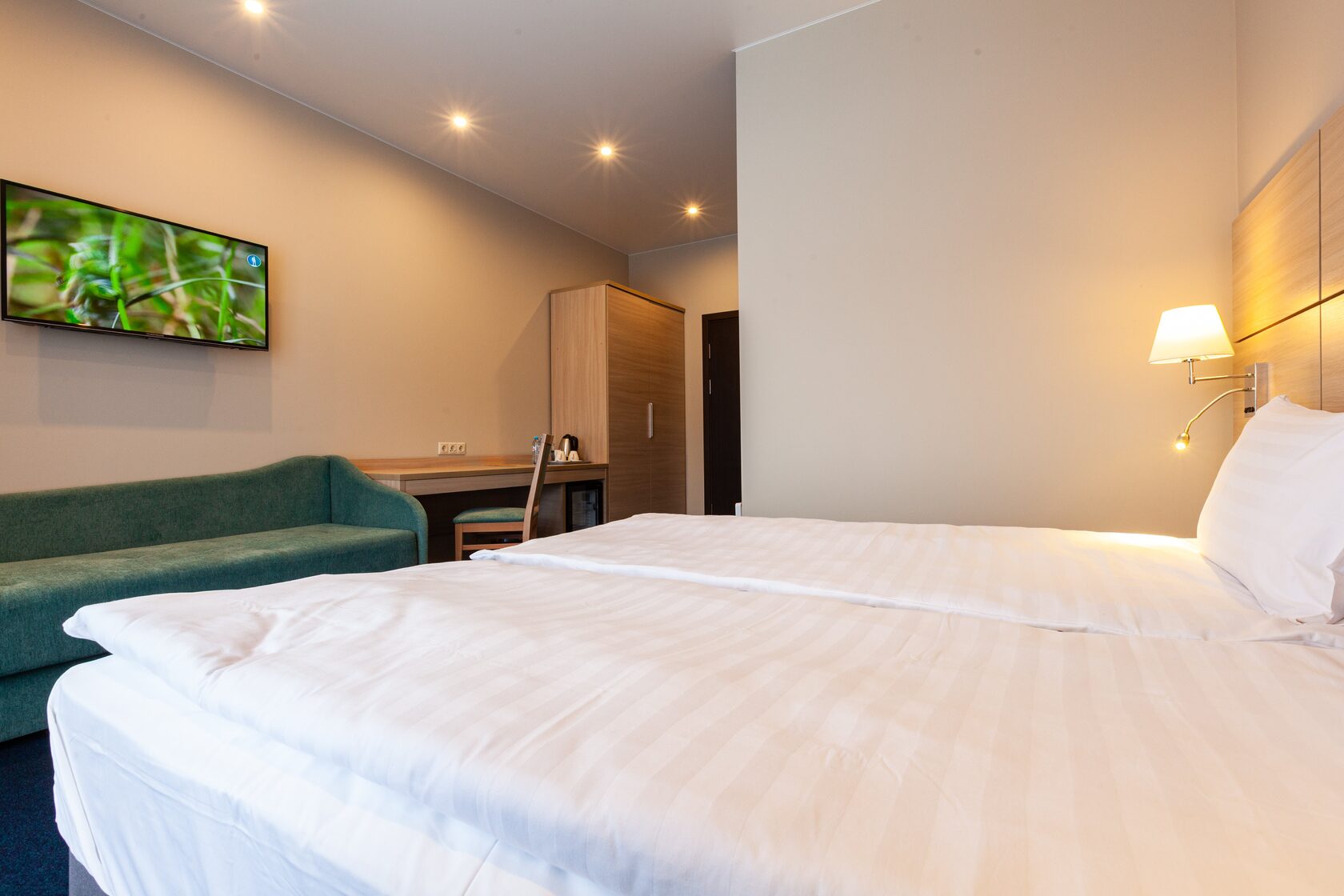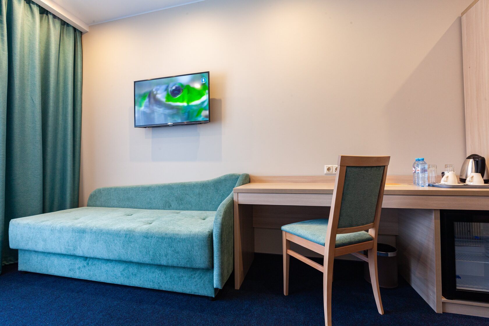 Номер оформлен в современном стиле с акцентами на комфорт и функциональность. Просторная спальня с удобной кроватью и кушеткой сочетаются с рабочей зоной с письменным столом. Ванная комната выполнена в сдержанном стиле и оснащена необходимыми принадлежностями. Номера данной категории находятся в главном гостиничном корпусе.
