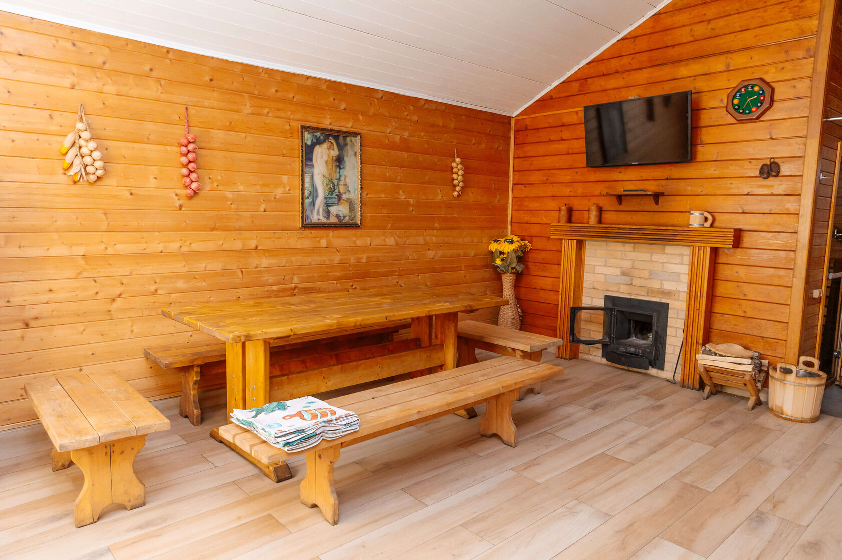 Баня лечит, баня правит, баня все исправит. Настоящая русская баня с оборудованной парной, купелью, зоной отдыха, чайной станцией и вениками из березы и дуба ждут Вас в самом уединенном месте отеля. Банный чан установлен рядом с баней и может принять до 6 гостей сразу.